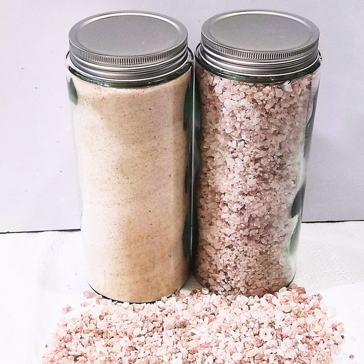 نمک صورتی 1400گرمی در ظرف شیشه ای استوانه ای با درب کانتینری فلزی دهانه 82میلیمتر
