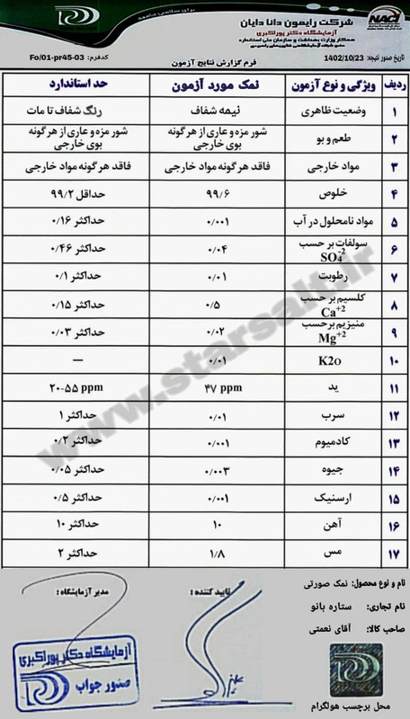 اللهم عجل لولیک الفرج.،،،،،،،، توجه تمامی محصولات سایت ستاره بانو اصل و معدنی و با ضمانت اصالت میباشد. ((تمامی نمک ها موجود مستقیم از معدن تهییه و صفرتا صد کار اعم از خُرد کردن سنگ نمک،دانه بندی و بسته بندی در مجموعه ستاره بانو انجام میشود)) حداقل مبلغ فروش سایت 200 هزارتومن میباشد، برای مشاهده تمامی محصولات پایین صفحه قسمت دسته بندی کلیک فرمایید... توجه: امکان خرید اقساطی محصولات در چهار قسط محیا میباشد، برای این منظور در صفحه پرداخت، درگاه ترب پی را انتخاب بفرمایید.